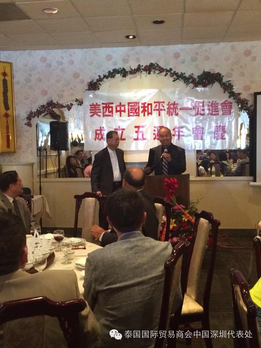 美西中国和平统一促进会于8月30日在南湾大鸿福餐厅举办了成立五周年会庆,中国驻旧金山总领事袁南生大使和夫人王芳出席大会。侨二组组长章禾领事,劳动领事和旧金山统促会,大上海联盟,华体会,中国企业协会,华夏联谊会,北加州和统会,河北同乡会,江苏同乡会,安徽同乡会,东北同乡会,亚洲表演艺术中心,ICN电视台,中国高校联合会,东南大学校友会,海外湖北联谊会等20多个社团120多位嘉宾参加了此次盛会。会场内坐无虚席,气氛热烈,掌声不断,高潮迭起。