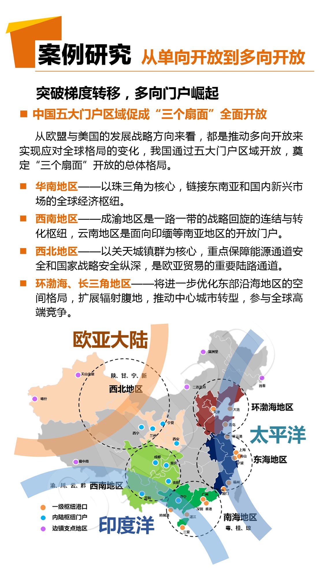 本篇从欧美空间战略的案例研究出发,提出了在“一带一路”新开放格局下,我国必须突破原有梯度发展、单向开放态势,形成高端切入、多向开放的国家区域空间新格局。并介绍了全国五大重点区域的空间规划应对和战略举措设想,包括珠三角-北部湾地区、西南地区、西北地区、环渤海和长三角地区。